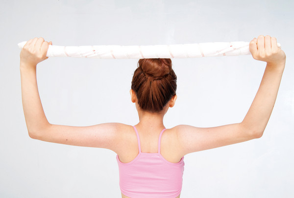 1、站定平舉。雙腳與肩同寬站定,兩手距一個拳頭寬握住毛巾中段,平舉與肩同高。