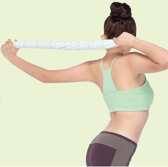 2、向上伸展。將毛巾上舉,雙手伸直向上延伸,深吸一口氣。